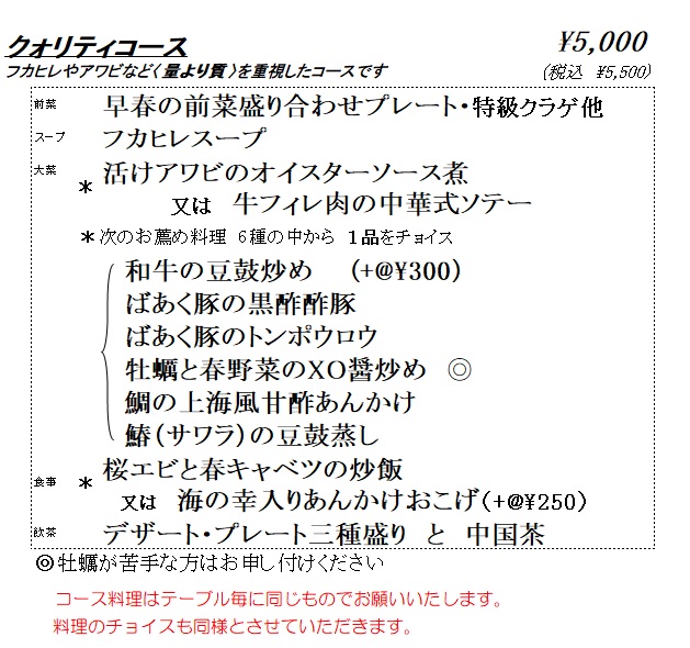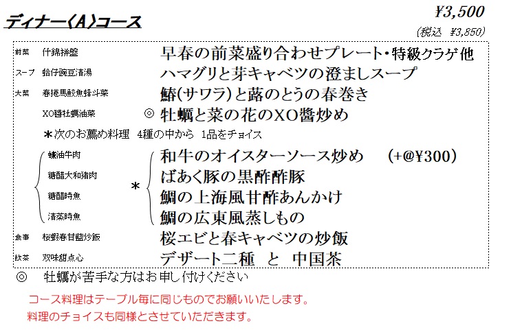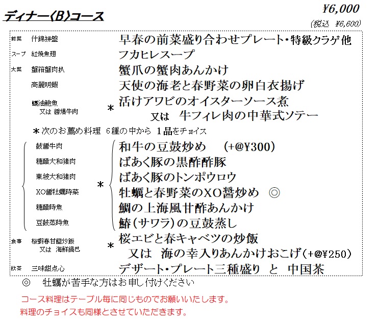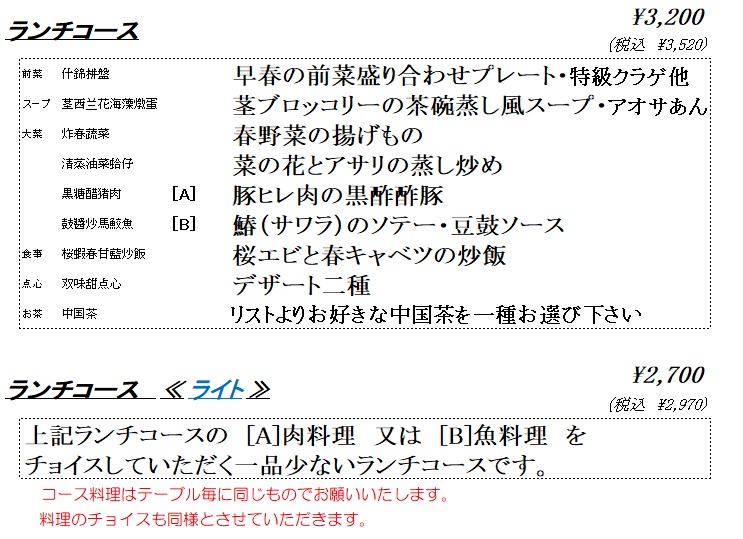 | デザート | プラス料金にてレギュラーメニューのデザートに変更可能です。 杏仁豆腐・マンゴープリン+300円、その他+250円 |